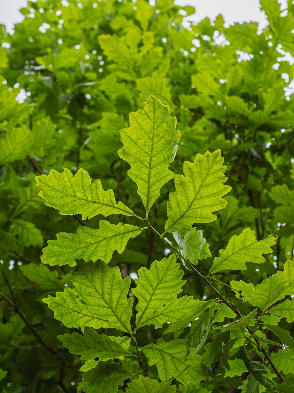 Quercus ×macdanielii HERITAGE ('Clemons') blooms in maj.