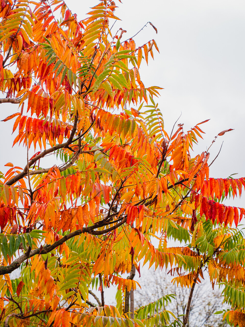 The leaves of Rhus typhina turn żółte, pomarańczowe, czerwone in autumn.